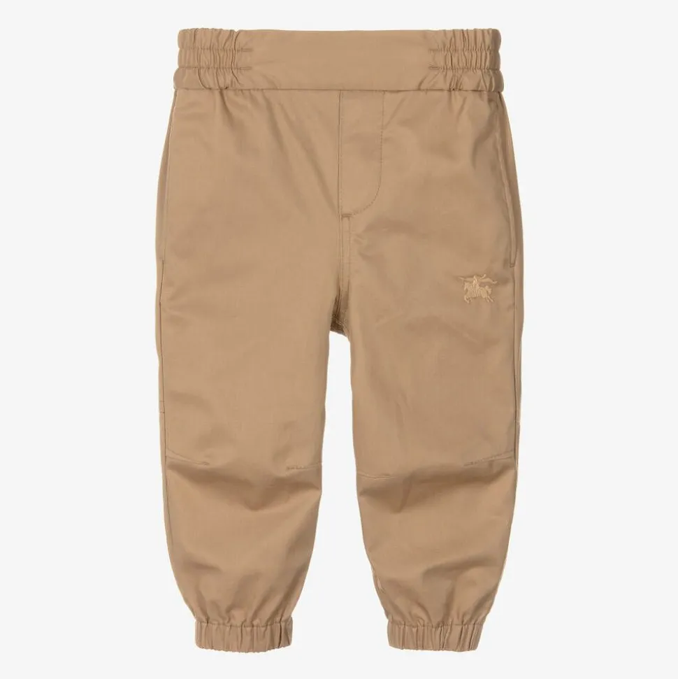 Casual trousers for baby boys from Burberry, made in the luxury British brand's Archive beige cotton twill. A tone-on-tone Equestrian Knight Design is embroidered on one leg for an iconic look. Soft and smooth, this comfortable style is designed in a relaxed fit with knee tucks, discreet side pockets and a back pocket. Simply pull-on, they have an elasticated waistband and ankle cuffs.