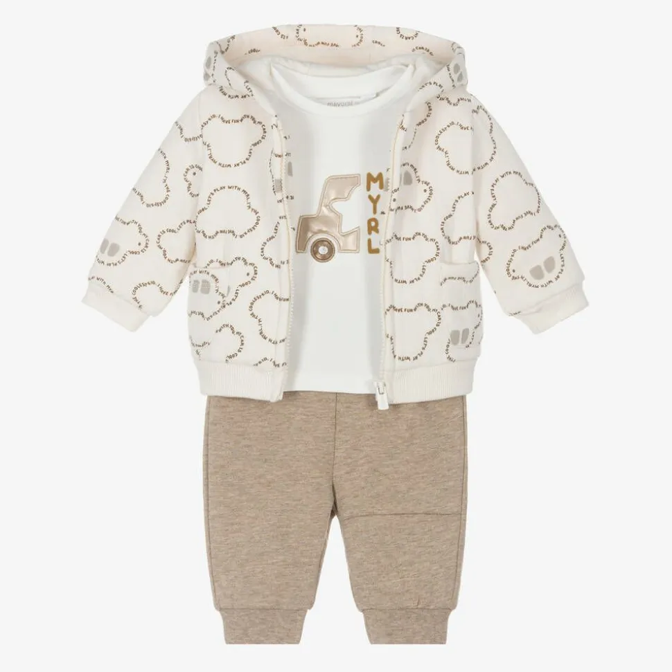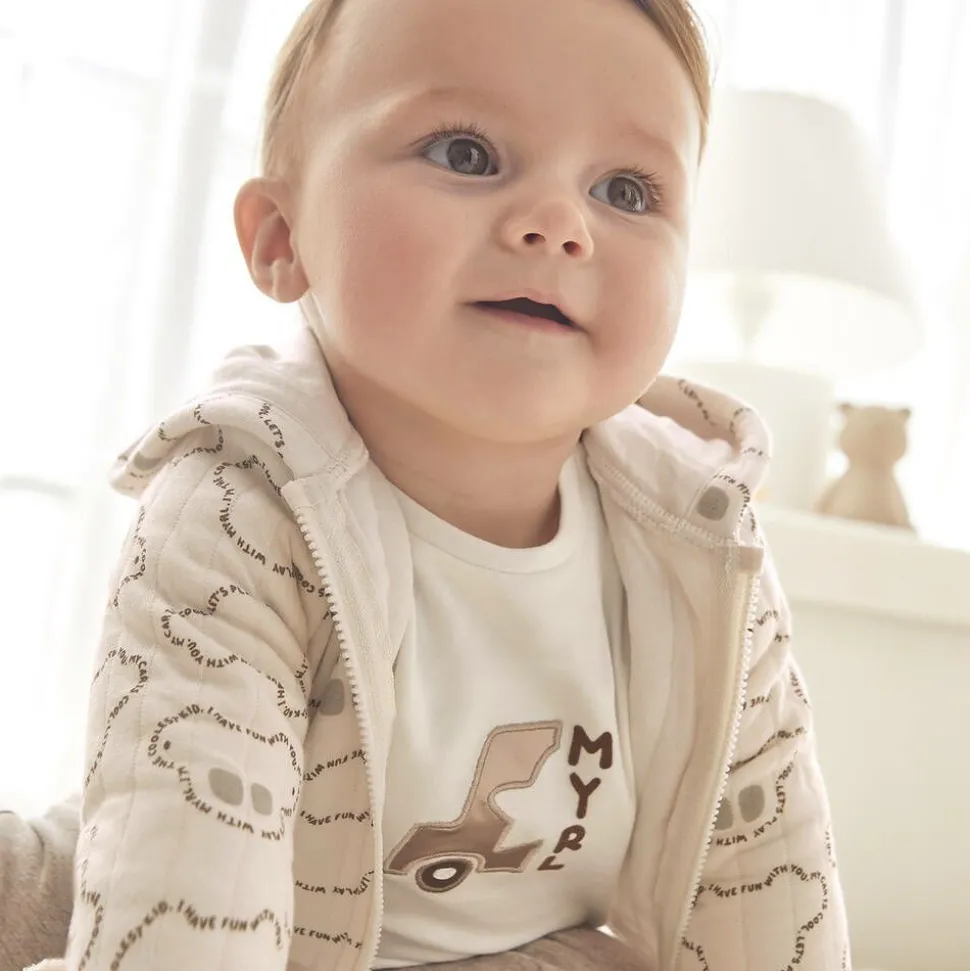 Designed for car fans in the making, this ivory and beige tracksuit for baby boys by Mayoral is made in comfortable and soft cotton jersey. The ivory long-sleeved tee has an embroidered bronze appliqué, a flocked logo and poppers on one shoulder. The zip-up top is made in a quilted effect jersey with a cute all-over print, ribbed trims and a cosy hood. A simple, pull-on style, the dark beige joggers have a little pocket on the back and cuffed ankles.