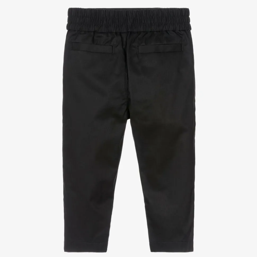 Black cotton trousers for baby boys by luxury designer Burberry. Smart-casual in soft twill, these comfortable chino trousers have a tonal Equestrian Knight Design embroidered on the leg which is a significant symbol of the British brand's heritage. They have side and back pockets, along with an elasticated waistband for ease of wear.