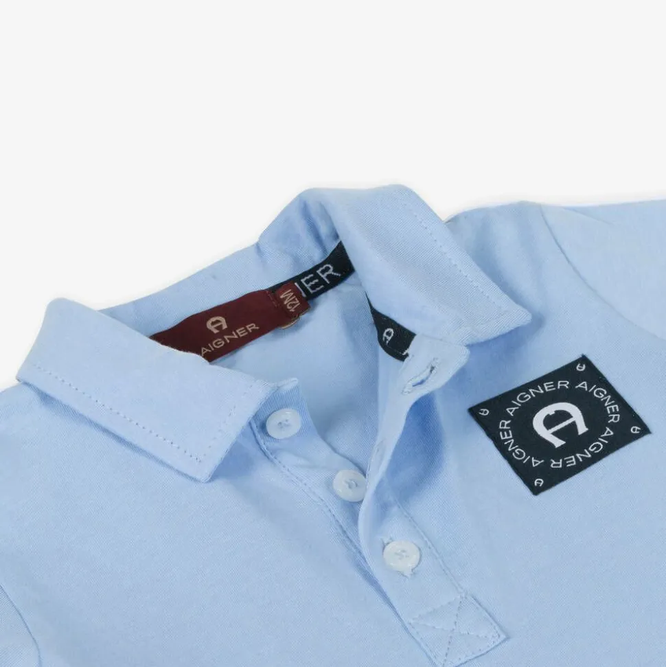 Light blue cotton polo shirt for baby boys by AIGNER, made in soft jersey with branded button fastenings. For a sporty look, it has panels of white and navy blue, with logo tape trimming the shoulders. Adding a designer finish, the signature 'A' horseshoe logo can be seen on the chest.
