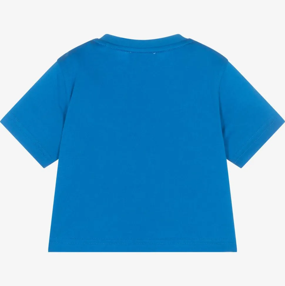 Casual blue cotton T-shirt for baby boys unmistakably by luxury British brand Burberry. It has the Burberry University logo printed on the front in burgundy red and white, incorporating the signature Equestrian Knight Design and oak leaf crest. Made in super soft, comfortable jersey, it has logo buttons on one shoulder for speedy dressing. This product contains organic cotton.