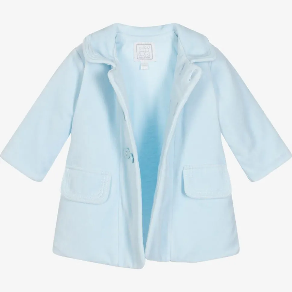 Lovely pale blue coat for baby boys by Emile et Rose, made in super soft cotton velour. It has a traditional double breasted style and faux front pockets. Lightly padded, it is lined with soft jersey for comfort.