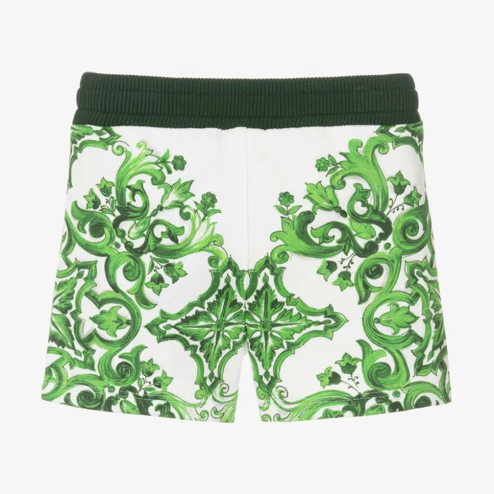 Instantly recognisable with their signature Majolica print inspired by Sicilian tiles, these white and green shorts for baby boys are by luxury Italian brand Dolce & Gabbana. Just right for adding designer style to casual days, they are made in soft, stretchy, sweatshirt jersey, with a ribbed, green waistband and a useful, white drawstring for a comfortable fit.