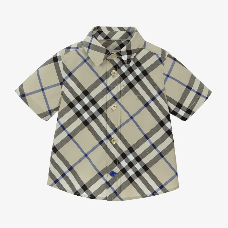 A grey short-sleeved shirt for baby boys by luxury British brand Burberry. Made from a smooth cotton weave, it is patterned with their iconic Burberry Check in shades of black, white, and blue. It has a smart pointed collar, a patch pocket on the chest, and fastens with ivory and blue pearlescent buttons on the front. This product contains organic cotton.