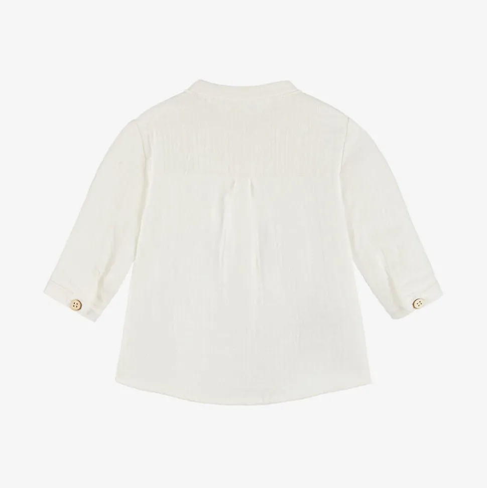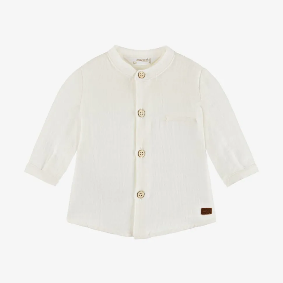 An ivory shirt for baby boys by Spanish brand Mayoral, made in soft and lightweight cotton with gentle slubs in the weave. This traditional, collarless style is ideal for a smart casual look with natural button fastenings on the front and cuffs. There is a faux chest pocket and a brown logo tab above the curved hem.
