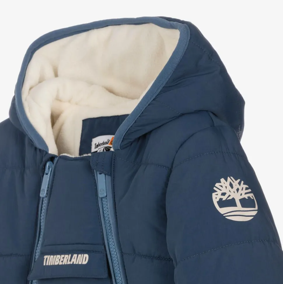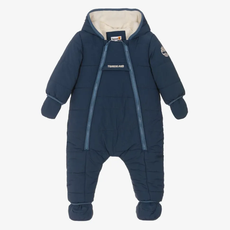 Navy blue snowsuit for baby boys by American brand Timberland, with a warm, ivory fleece lining. Water repellent and gently padded, this cosy hooded snowsuit has double zip fastenings on the front, with protective chin guards at the top. For an extra snug feel, matching mittens and booties secure with poppers. An ivory logo is stamped on the velcro fastening front pocket and the brand's signature tree logo is printed on one sleeve. This product contains at least 70% recycled material.
