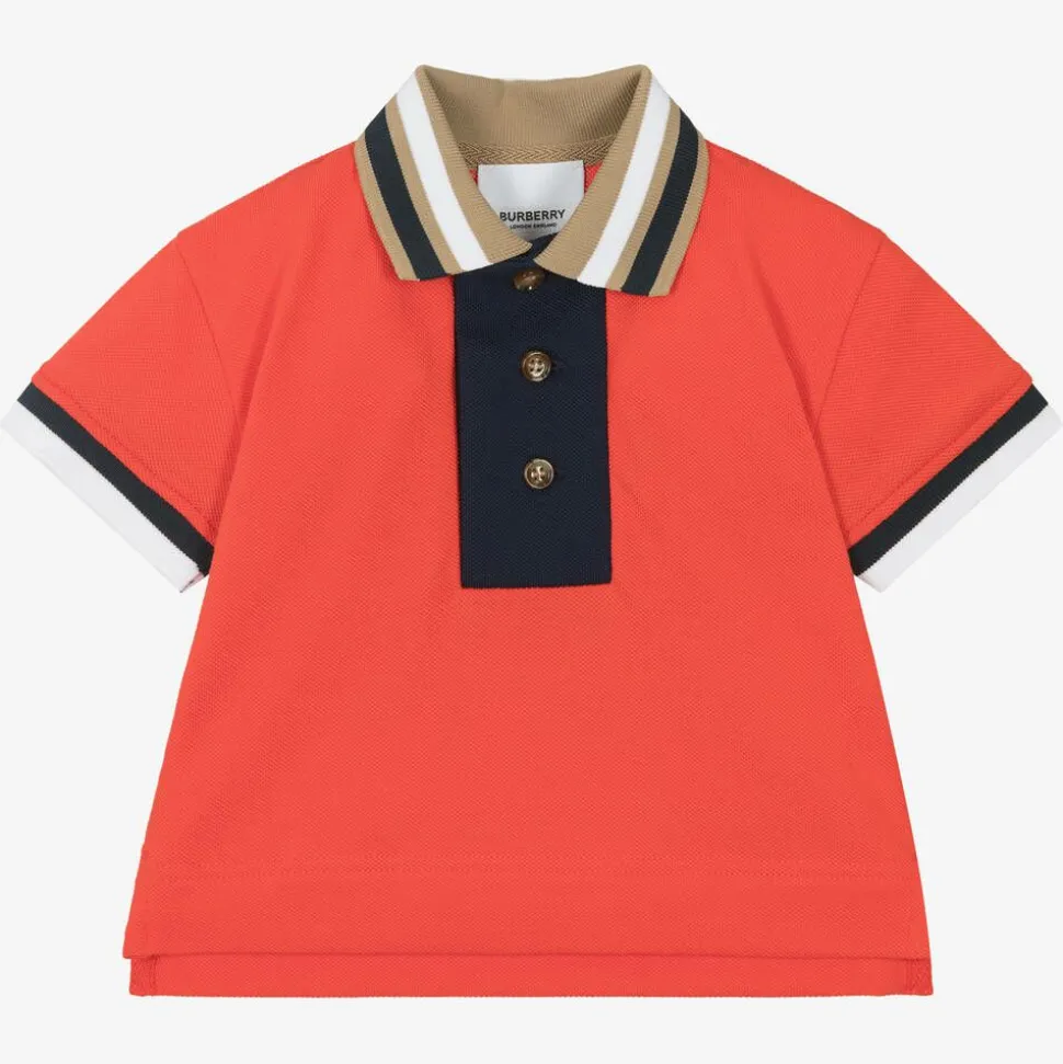 Bright red, college-inspired cotton polo shirt for baby boys unmistakably by luxury British brand Burberry. It has the Burberry University logo printed on the back in white and navy blue, incorporating the signature Equestrian Knight Design and oak leaf crest. Made in comfortable, breathable piqué, it has ribbed trims striped in beige, white and navy blue, with a contemporary, wide, navy blue, buttoned placket. There are side vents on the hemline, which is longer around the back than the front. This product contains organic cotton.