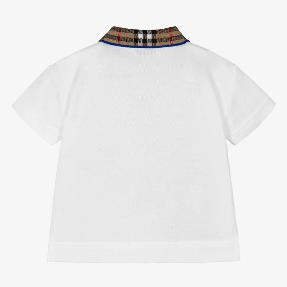 White polo shirt for baby boys by luxury British designer Burberry, made in soft cotton piqué. Instantly recognisable, this short-sleeved top features the label's iconic Burberry check collar with a signature Knight blue trim. It is embroidered with a tonal Equestrian Knight Design logo and has concealed button fastenings on the front. This item contains organic cotton.