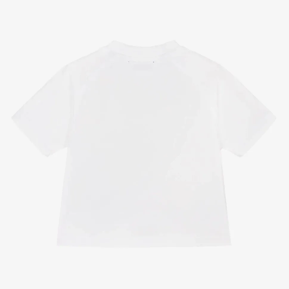A white T-shirt for baby boys by luxury British brand Burberry, made from soft and stretchy cotton jersey. This distinctive tee features the designer's iconic Equestrian Knight Design in a colourful shape pattern. It has a crew neck and short sleeves, and fastens effortlessly with poppers on one shoulder. This product contains organic cotton.
