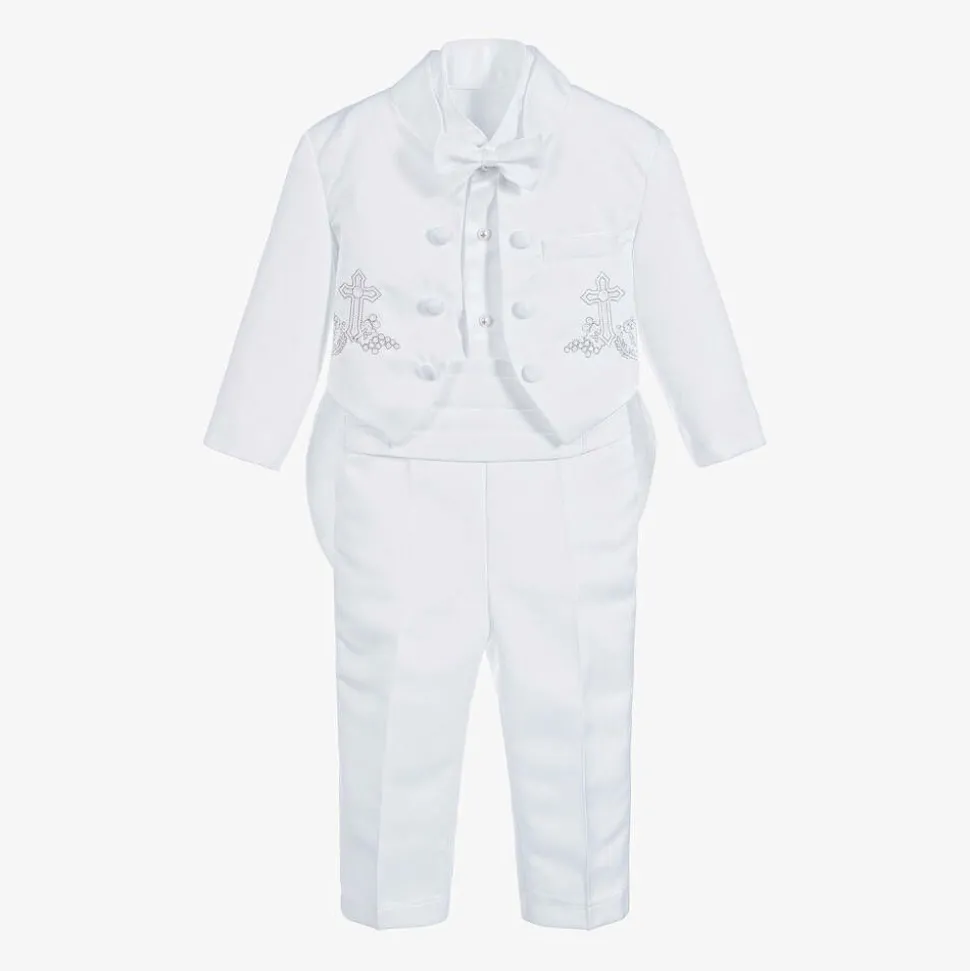 Smart white trouser set for baby boys by Beau KiD, made in luxurious, silky satin. The long-sleeved shirt fastens with glossy, pearlised buttons and has an attached bow tie. The lined jacket has a delicate silver Cross embroidery and covered button fastenings. This lovely outfit is complete with coordinating trousers, an adjustable cummerbund and a flat cap.