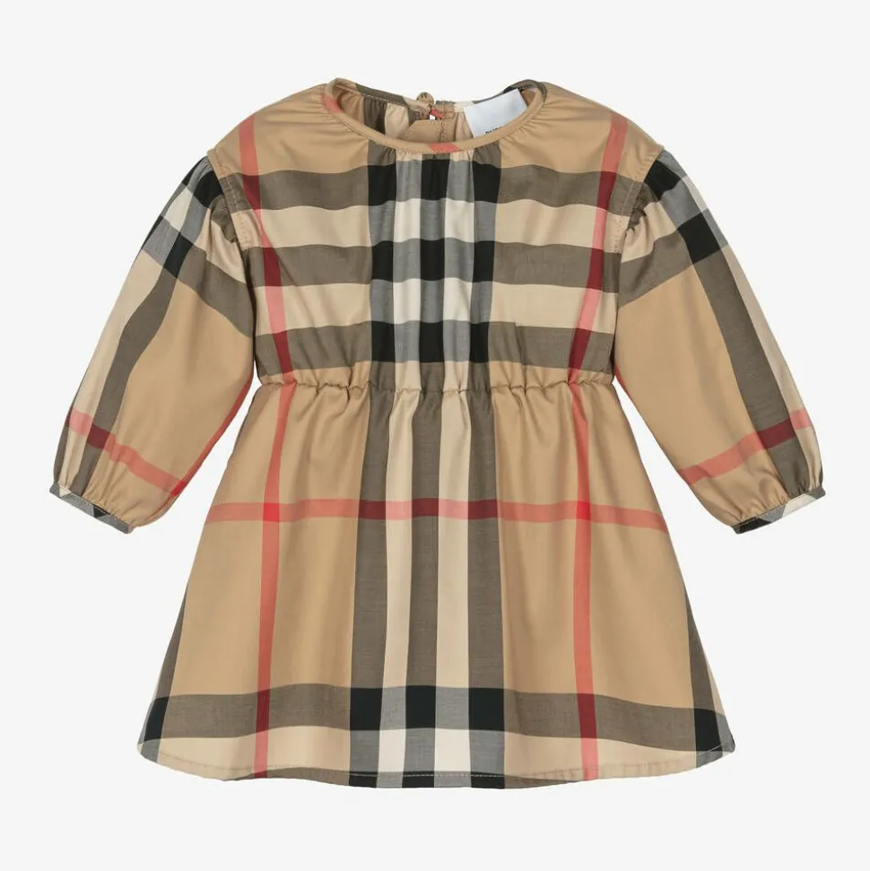 Archive beige dress for baby girls by luxury brand Burberry, made from soft cotton poplin. Creating a sweet designer look, this dress is patterned in the iconic oversized check design. It has a stretchy waistband, a flowy skirt and puff sleeves. A button and concealed zip fastens on the back.