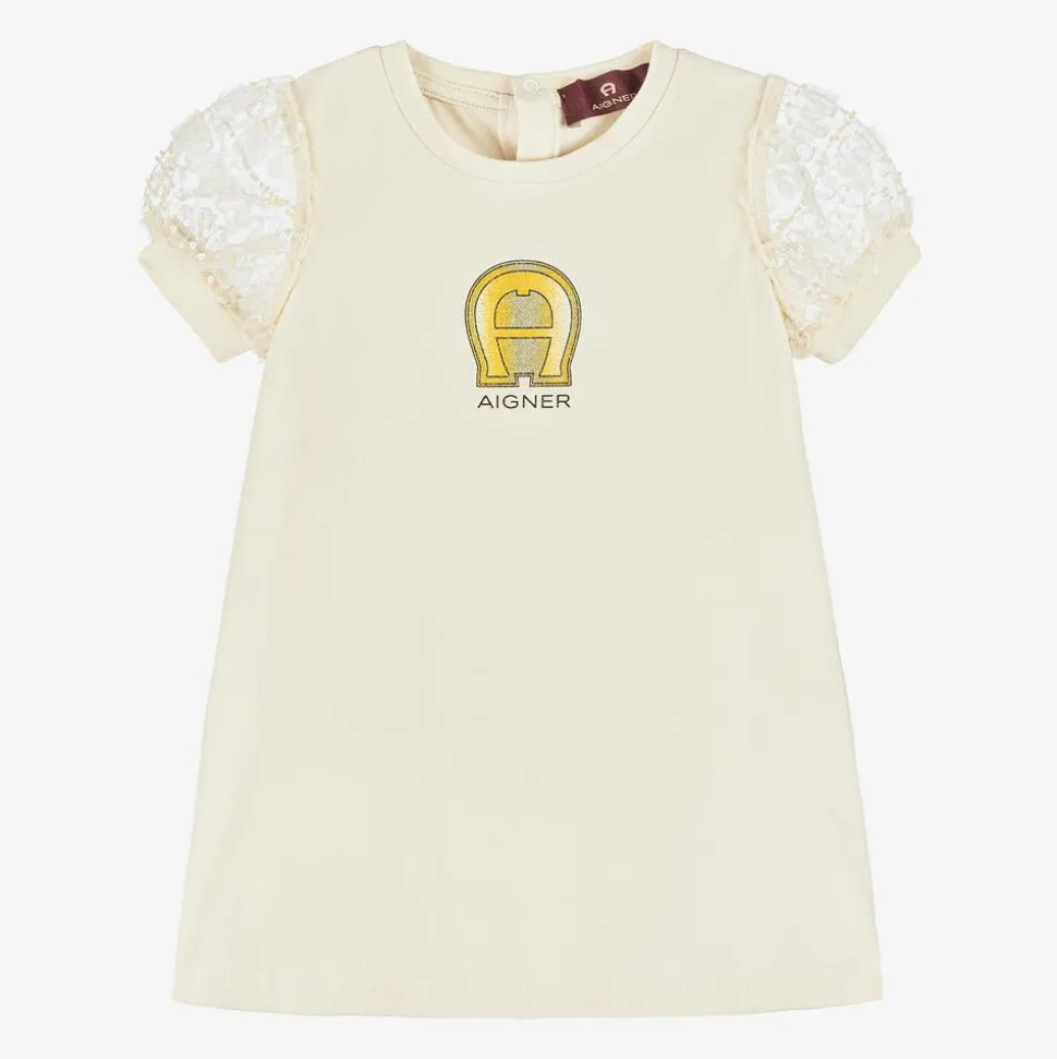 Pale beige dress for baby girls by AIGNER, made in comfortable cotton jersey. The elegant puffed sleeves are in soft tulle, embellished with shiny beads and sequins. Adding extra sparkle, a signature 'A' horseshoe logo is printed in glittery gold on the front. There are easy-fastening poppers on the back.