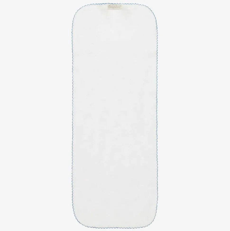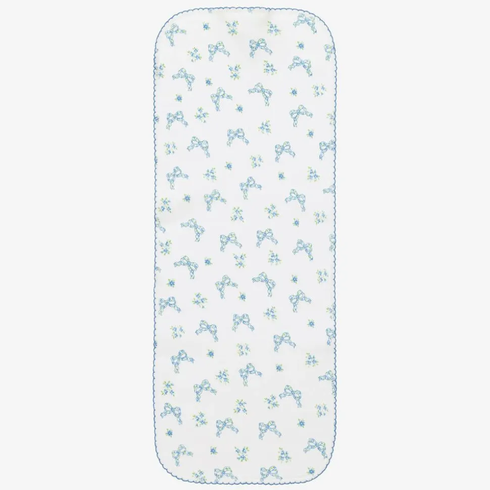 Sweet white burp cloth for baby girls by Kissy Kissy, with a lovely bow and floral print in blue and green. Made in beautifully soft Pima cotton jersey, it has an absorbent cotton towelling backing and blue picot trim. This useful feeding accessory can be placed over the shoulder when burping your baby and used for wiping those little spills after a feed.