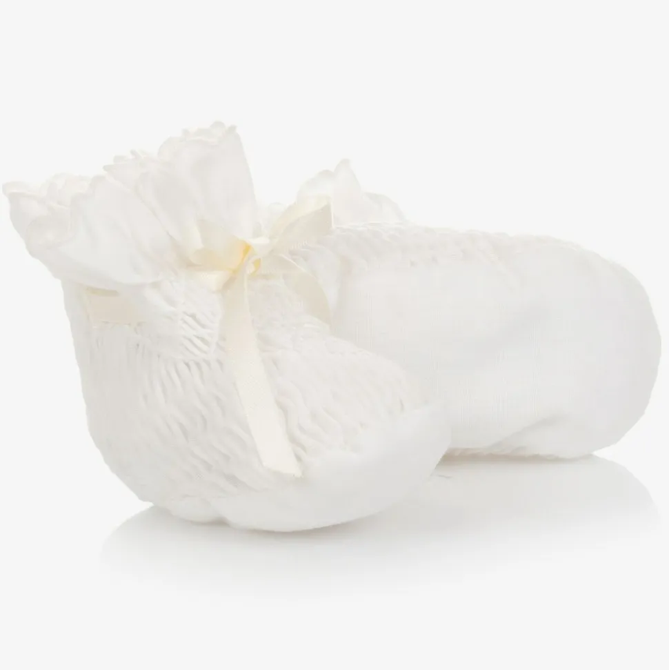 Pale ivory booties for baby girls by British brand Sarah Louise, made in soft polycotton. They have hand-smocked detailing and delicate hand-embroidered ivory rosebuds. There are scalloped ruffles around the ankles, with satin ribbon ties to fasten.
