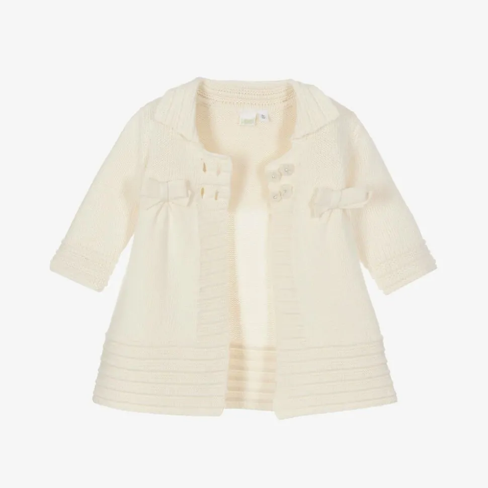 A charming ivory pram coat for baby girls by iDO Mini. Knitted in soft cotton, it has tonal ribbed trims and pretty bow details on the front. Designed with a sweet pointed collar, it fastens with pearlescent and diamanté flower buttons on the chest.