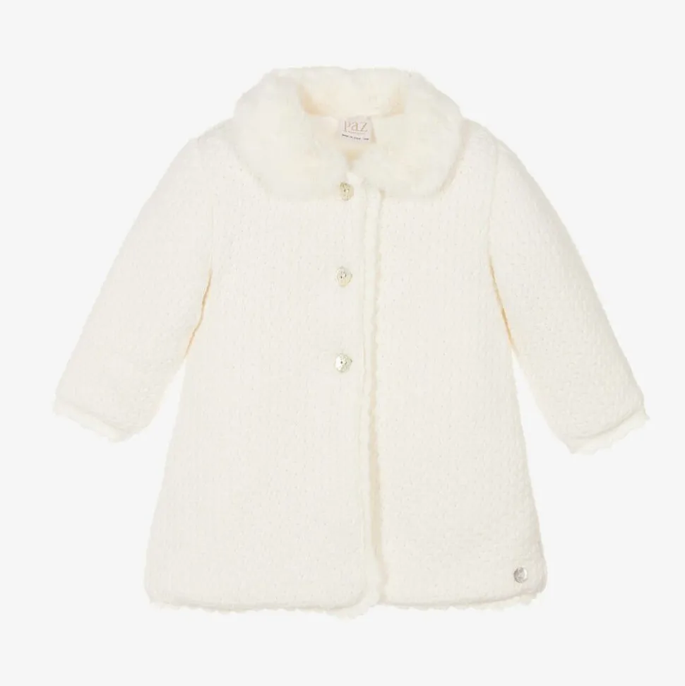 Ivory softly knitted coat for baby girls by Spanish label Paz Rodriguez. Traditionally styled, this cosy coat has a super soft faux fur collar and a pretty scalloped knit trim. Lined in soft velour for extra warmth, it fastens with mother-of-pearl branded buttons on the front. A delicate logo charm stitched just above the hem adds a sweet designer finish.