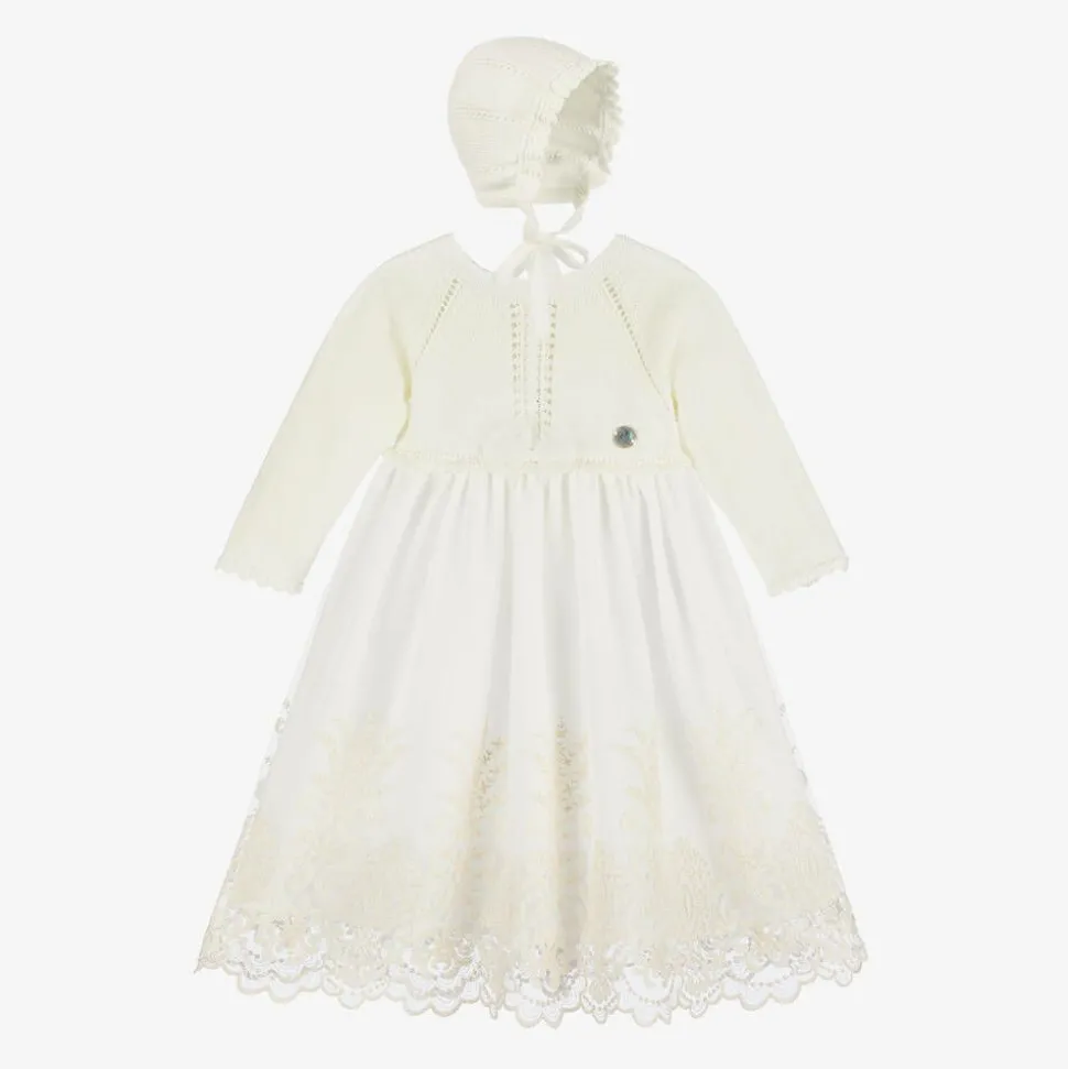 An ivory and white ceremony gown and bonnet set for baby girls by ArtesanĂa Granlei, both signed with mother-of-pearl logo charms. The long-sleeved bodice is made in a soft knit and decorated with beautiful openwork detailing, a tulle bow, and scalloped edges. The cotton-blend skirt is overlayed with embroidered tulle, adding an ornate, classic element to the look. It fastens with pearlescent back buttons. The knitted bonnet ties under her chin to keep it securely in place.