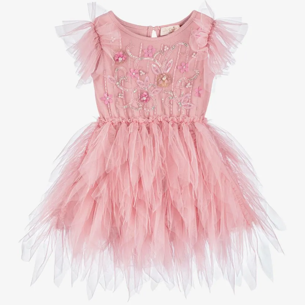 Pretty pink dress for baby girls by Tutu du Monde, hand-crafted in the finest tulle. The jersey bodice is hand-embellished with sparkling beads, faux pearls and tulle flower decorations for a beautiful look. Statement volume is created by the fabulous tutu skirt. Lined for comfort, it fastens with a pearlised keyhole button on the back. To complete the look, it comes with comfortable, elasticated knickers. Items are made to last and become more lovely with wear as slight fading and fraying edges adds to their charm.