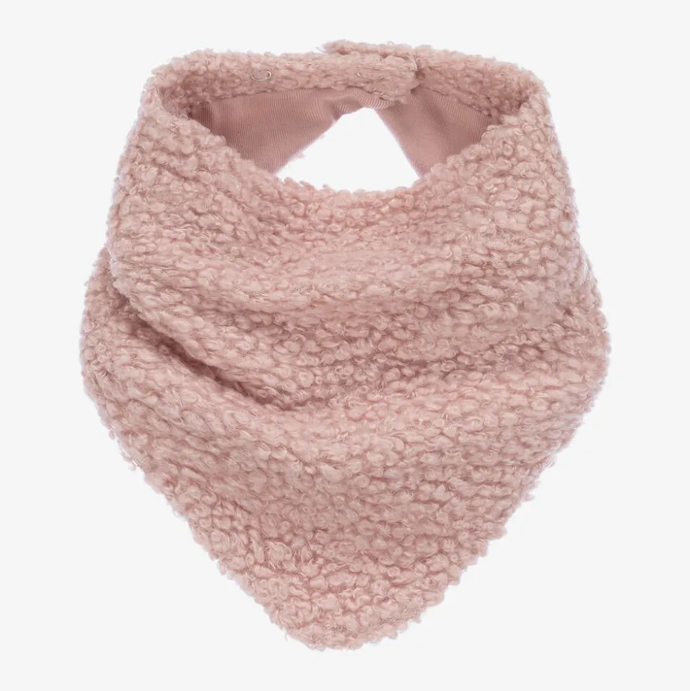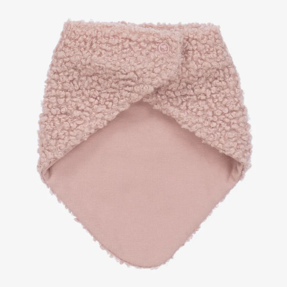 Cosy and comfortable for baby girls, a pink bouclé scarf by Polish brand Jamiks. This bandana-style neck warmer has a soft cotton jersey lining and fastens easily with a single popper behind the neck.