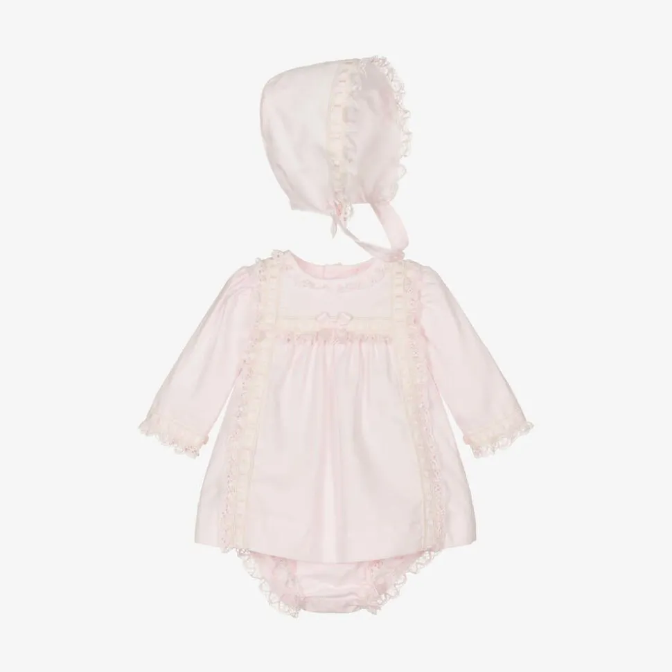 Lovely pink dress set for baby girls by Spanish brand Miranda, made in soft cotton. This traditional outfit comprises a dress with matching knickers and a bonnet. All three pieces have pretty ivory and pink lace and ribbon trims. Lined for comfort, the dress has long sleeves and button fastenings on the back. The bonnet is also lined and has a gently elasticated back. It secures neatly with a button under the chin.