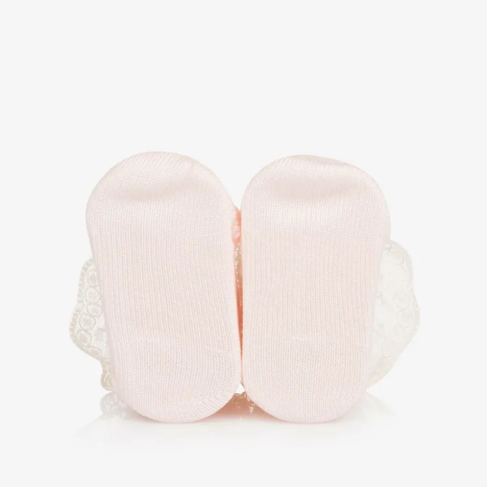 Pale pink socks for baby girls by Spanish brand Carlomagno, with pretty frilly lace trims. Comfortable on tiny feet, they are made in a soft and stretchy cotton blend.