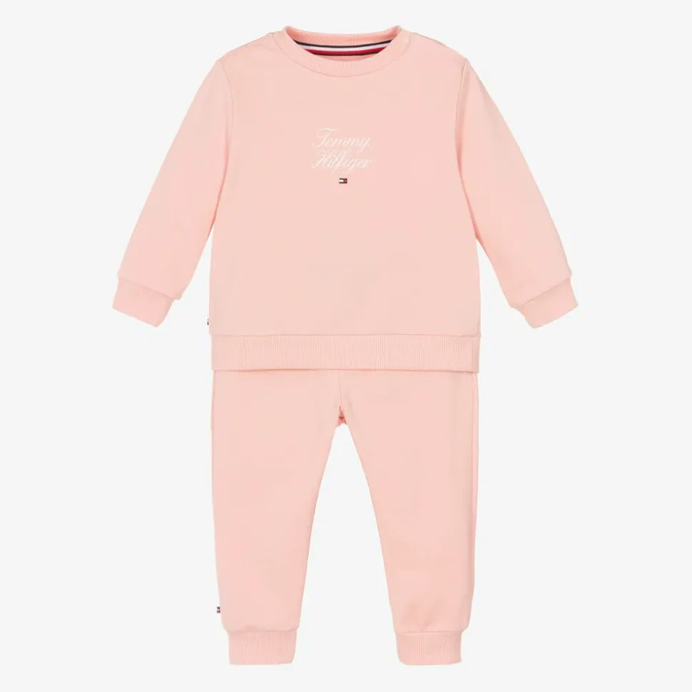Pink tracksuit for baby girls by Tommy Hilfiger, made in soft cotton jersey. The sweatshirt has a white signature logo printed on the front and popper fastenings on one shoulder. The joggers have side seam pockets, with a further pocket on the back and tricolour drawstring ties on the gently elasticated waistband. Both pieces are embroidered with the iconic flag logo for a distinctive finish. This product is made with at least 95% organic cotton.