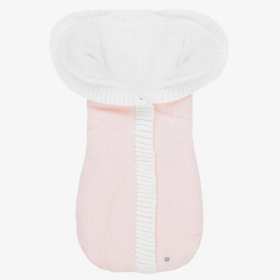 A lovely pale pink knitted baby nest for girls by Minutus. Beautifully soft and warmly padded, it has a white knitted lining and knitted ruffle trims. There is a concealed front zip fastening, with a small branded tab at the bottom.
