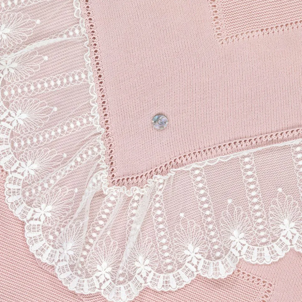Lovely pale pink blanket for baby girls by Spanish brand ArtesanĂa Granlei, with an ivory lace overlay on the border. Soft and lightweight, it is knitted in different patterns to give a contrasting centre and border, and has an iridescent mother-of-pearl logo charm sewn in one corner. The blanket is just right for use in the nursery, or for presenting baby to family and friends.