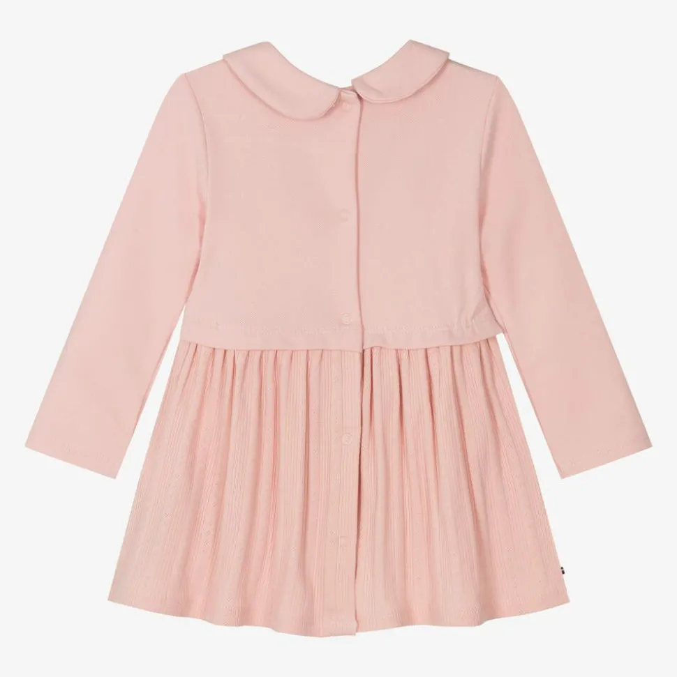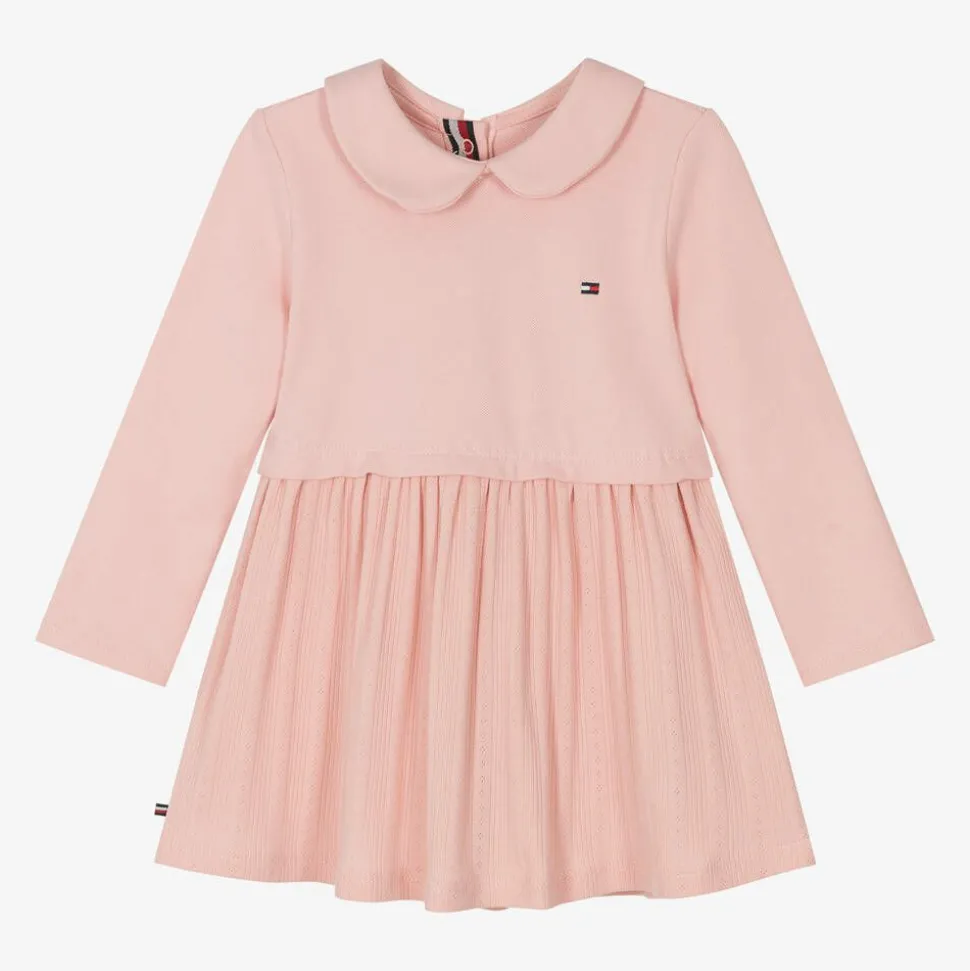 A light pink dress for baby girls by Tommy Hilfiger, bringing together a cotton piqué bodice with a soft pointelle knit skirt. It has a rounded Peter Pan collar and long sleeves for chillier seasons. Poppers fasten with ease on the back. The brand's iconic flag motif is embroidered on the chest and a small tab is stitched on the side seam for a branded look.