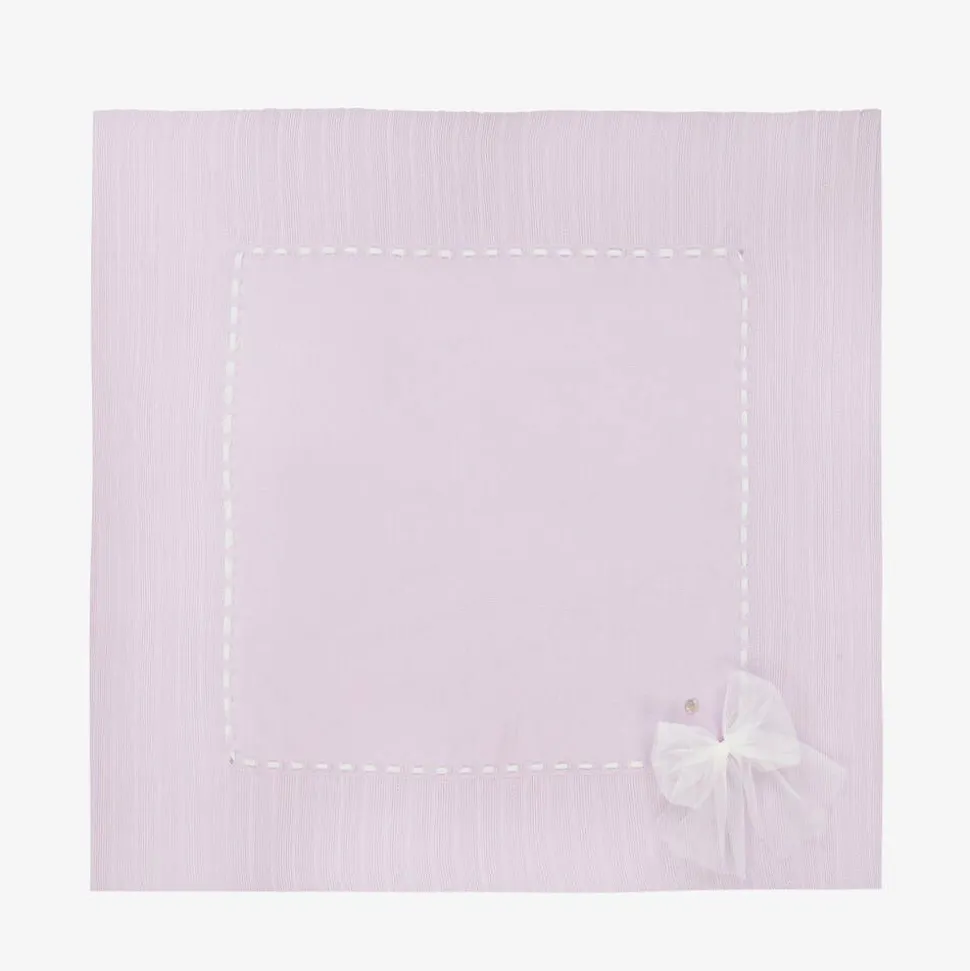 Lovely lilac purple blanket for baby girls by Spanish brand Artesania Granlei, with a large, white tulle bow in one corner and a matching tulle trim interlaced around the border. Made in a soft, lightweight knit, it has a mother-of-pearl logo charm sewn in one corner and is ideal for use in the nursery or for presenting baby to family and friends.