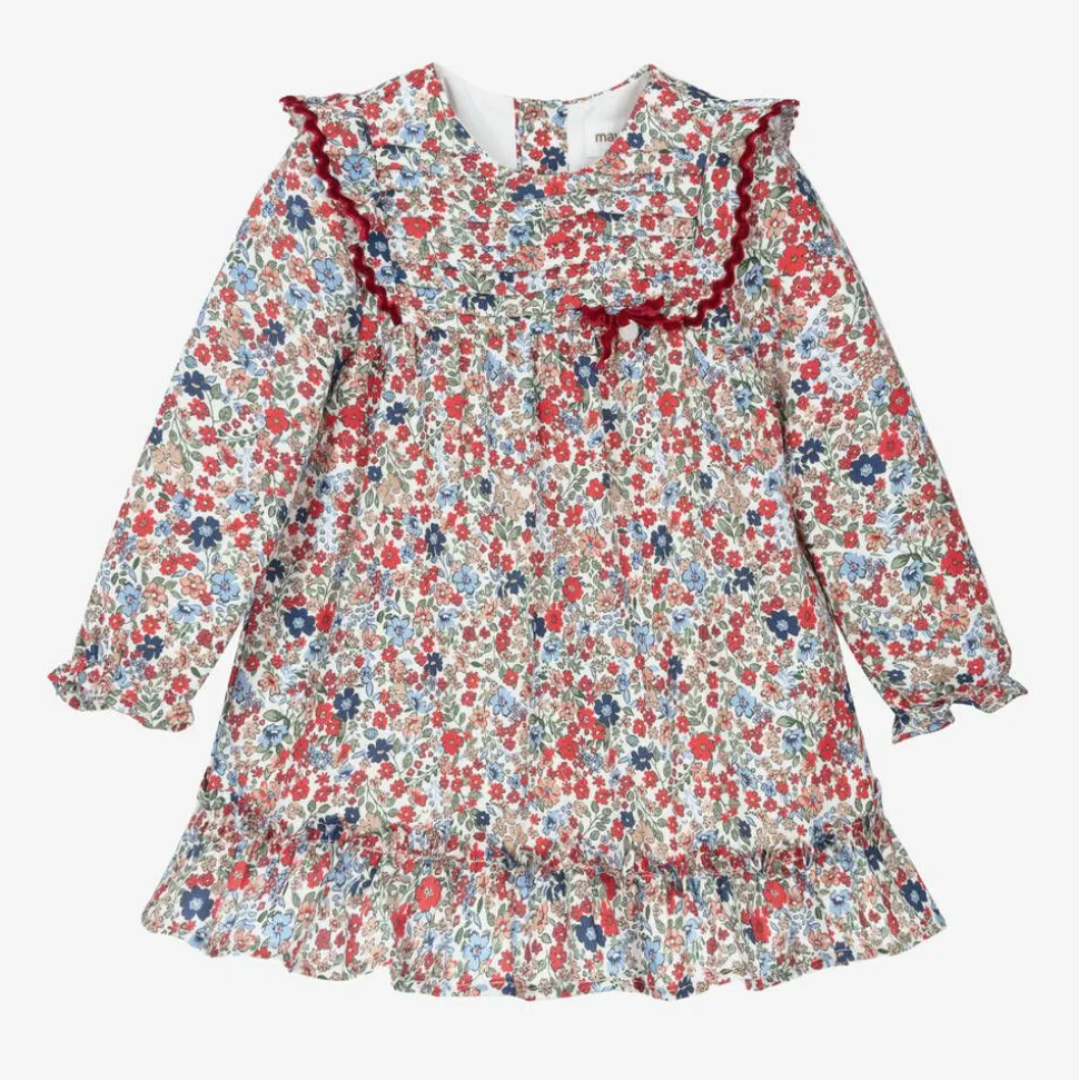 Sweet red and blue cotton dress for baby girls by Spanish brand Mayoral. Patterned with a charming floral print, this puffed sleeved dress has smart pintuck pleats on the bodice with red velvet ruffles and a little bow. It is lined in soft cotton for comfort against little one's delicate skin and fastens with buttons on the back.