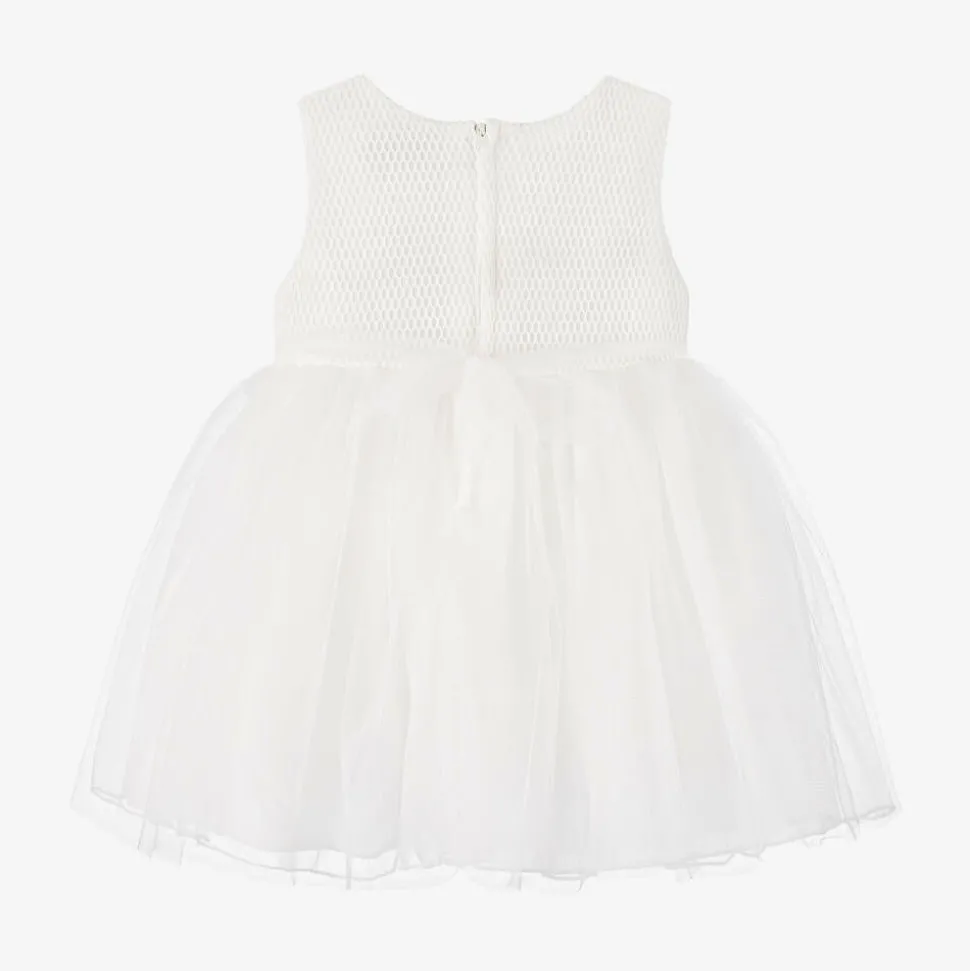 Baby girls white dress and headband set from Beau KiD. The bodice is made in pretty soft mesh with pearl trim on the neck. The skirt has gathered layers of voluminous tulle and is decorated with fabric flowers, leaves and diamantés. There is a removable flower and tulle brooch on the back and a matching stretchy lace headband.