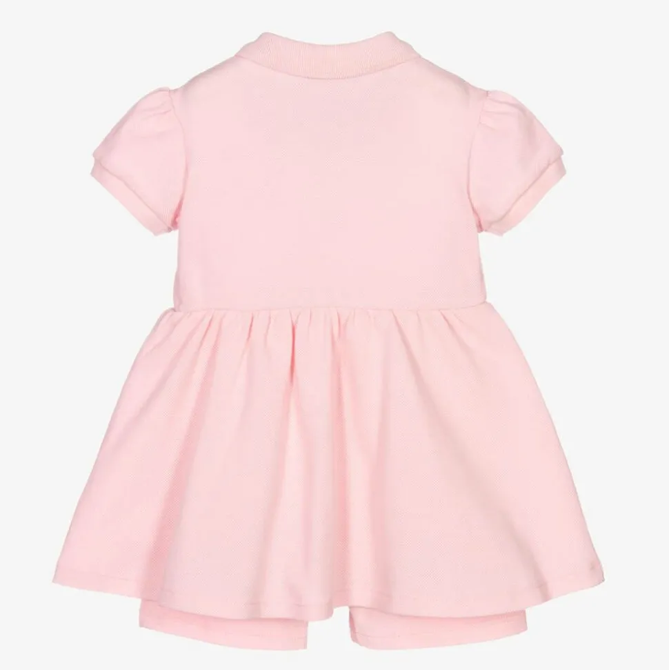 Baby girls pale pink dress by luxury Italian designer Versace, made in soft and stretchy cotton piqué. Classic and iconic, it has the Medusa logo patch embroidered in fuchsia pink on the chest. This polo style dress has little puffed sleeves, ribbed trims and attached shorts underneath.