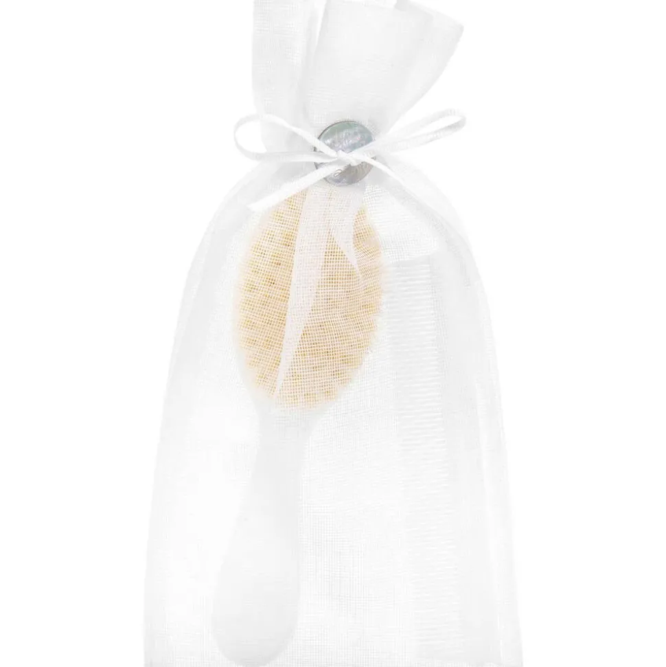 A sweet white hairbrush and comb set for baby boys and girls from Tartine et Chocolat. The hairbrush has embroidered logo initials on the back and firm, silk bristles. A matching fine-tooth comb is included and an organza gift bag.