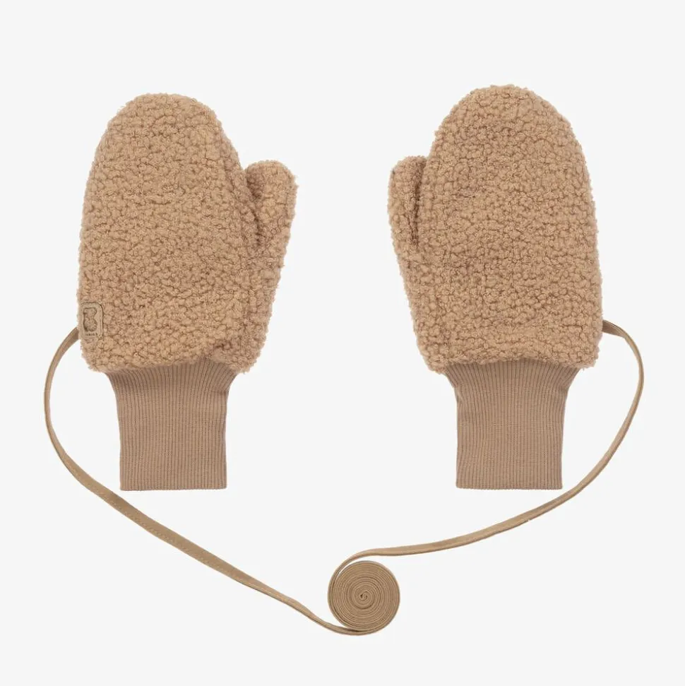 Beige mittens for boys and girls from Jamiks, made in soft bouclé fleece. Lovely for those colder days, they have a cotton fleece lining for extra warmth and stretchy ribbed cuffs. The attached strap threads through the sleeves of their coat, to ensure the mittens do not get lost.