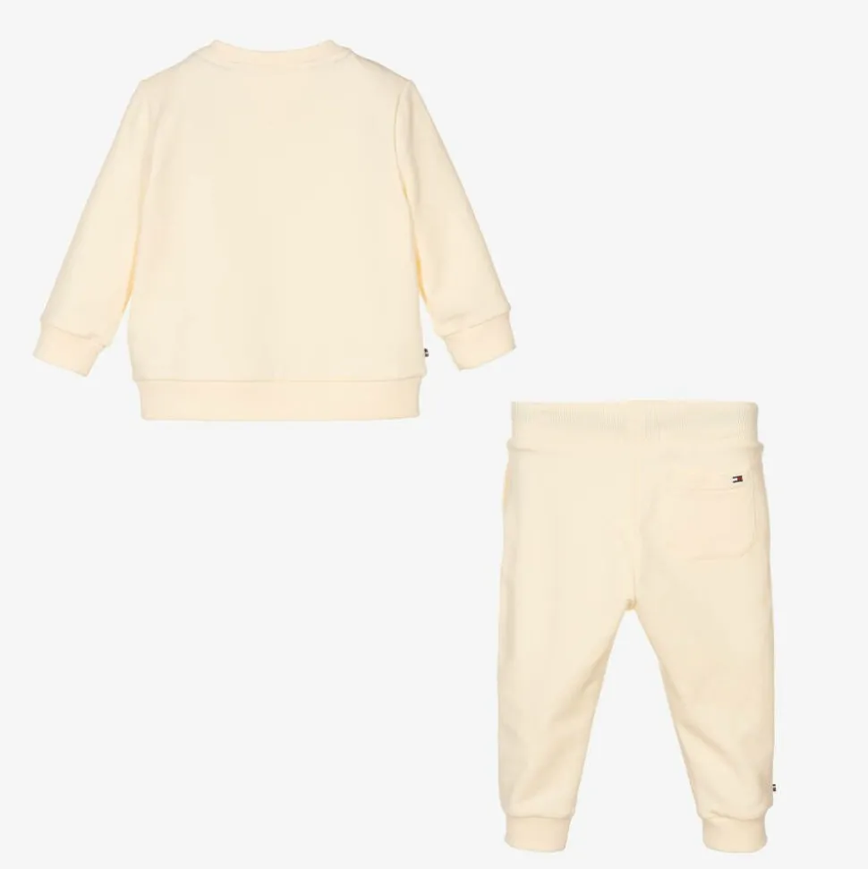 Beige tracksuit for baby boys and girls by Tommy Hilfiger, made in soft and comfortable cotton jersey. The sweatshirt has a navy blue logo print and fastens with poppers on one shoulder. The joggers have side seam pockets, a back patch pocket and tricolour drawstring ties on the elasticated waistband. Both pieces are embroidered with the signature flag logo for a distinctive finish. This product is made with at least 95% organic cotton.