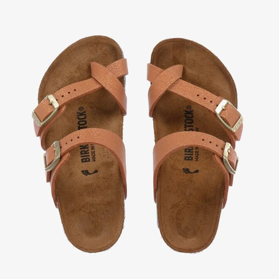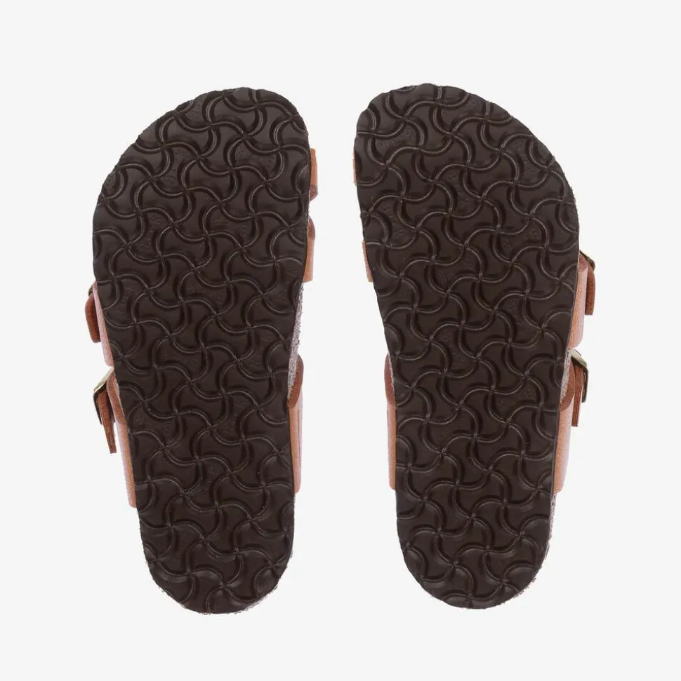 Classic sandals for boys and girls by Birkenstock, in grained tan-beige faux leather. This functional style has a cross-over, double-strap design, with adjustable gold-tone buckles for a great fit. Narrow fitting, they have a suede footbed that moulds to the contours of their feet. They are finished with ridged non-slip rubber outsoles.