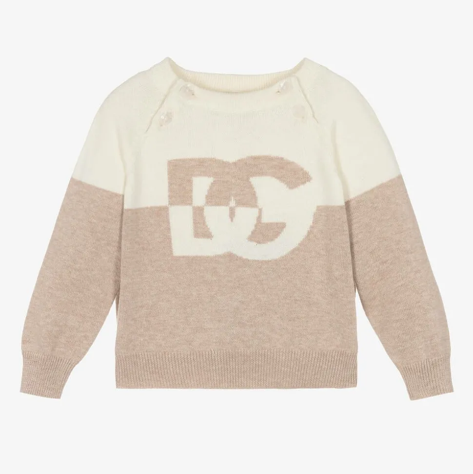 A lovely beige and ivory sweater for little boys and girls by luxury Italian designer Dolce & Gabbana. It has a bold crossover DG logo on the front for a statement look. There are raglan sleeves, both sides fastening with branded buttons to help with dressing. Finely knitted in a soft cotton and cashmere blend, this long-sleeved jumper provides lightweight warmth on cooler days.
