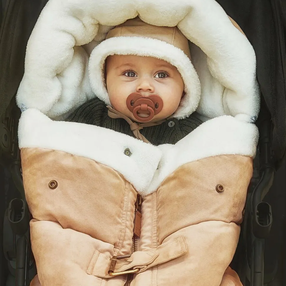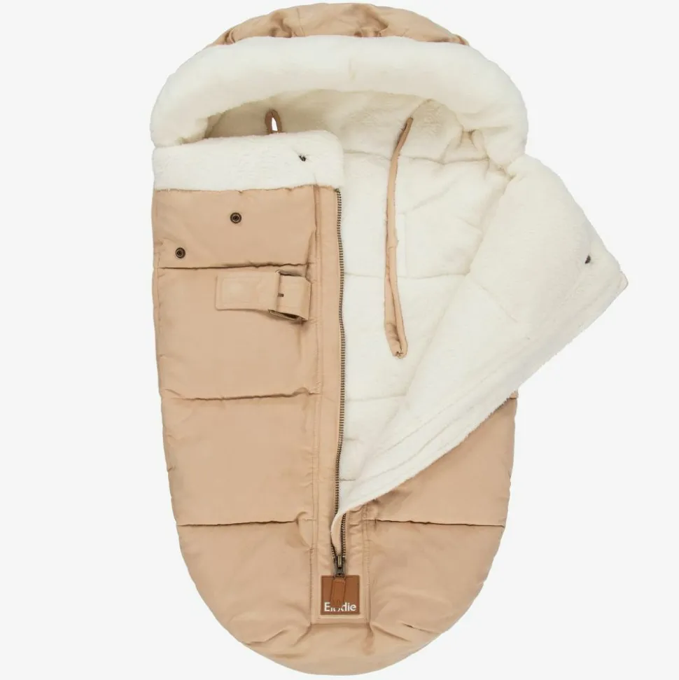 Beige footmuff for baby boys and girls by Swedish brand Elodie, with ivory faux fur trim. Made in a soft suede-feel fabric, it is thickly padded for warmth and lined in plush ivory faux fur. It has a chunky central zip fastening, with poppers at the top for opening up and fixing down. There are pre-cut holes at the back for attaching to a car seat or stroller.