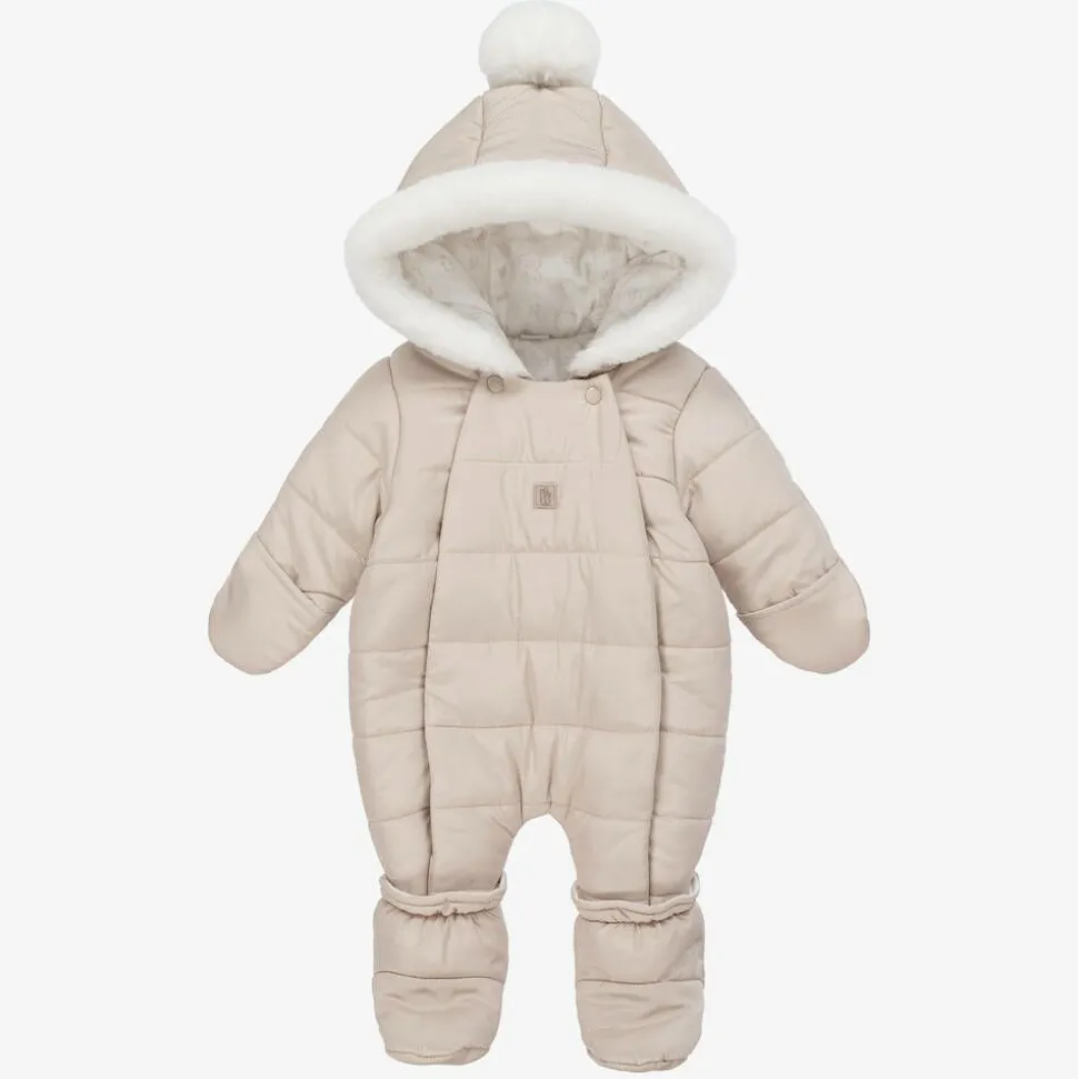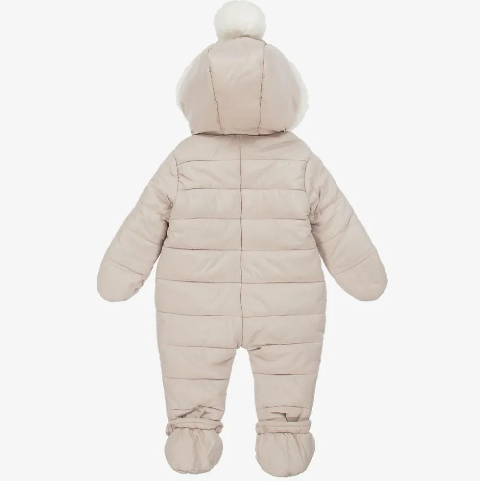 Adorable beige padded snowsuit for baby boys and girls by iDO Mini. Ideal for snowy days, this jersey-lined snowsuit has a snuggly hood with a plush trim and fold-over mitts to keep little one's hands warm. It fastens with a double zip and poppers on the front for easy dressing. Tiny feet stay super cosy with the detachable booties.