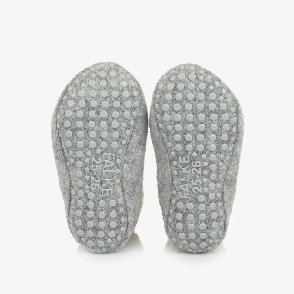 A cosy pair of beige and grey slipper socks for boys and girls by Falke, knitted in a soft Merino wool blend. Great for indoor use, these ergonomic socks have snug fold-over cuffs, and a sturdy felt sole. The soles are finished with anti-slip rubberised pads, offering improved grip on smooth surfaces.