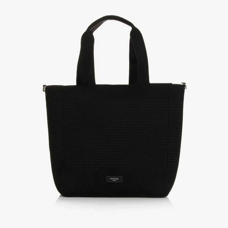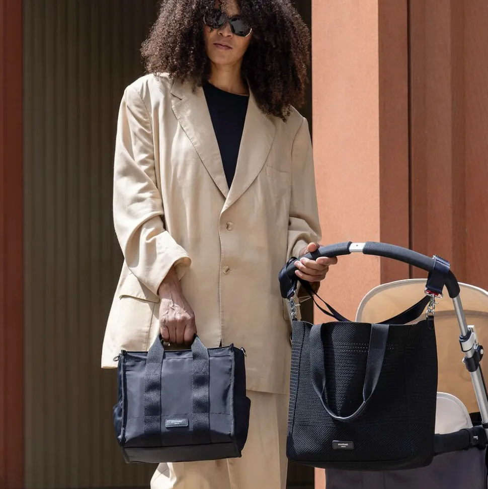 A versatile 2-in-1 black changing bag by Storksak. The large, open-top tote is made in an ultra-durable knit construction for a flexible, lightweight yet stylish look, with a detachable inner zip pocket. Fits easily into the tote, the compact organiser bag has six useful pockets for baby's essentials on the go and a removable, insulated bottle pocket. Compatible for use with both bags, the detachable and adjustable shoulder strap can also hook onto a stroller with the velcro tabs. A washable, padded changing mat with side pockets and a practical carry is included.