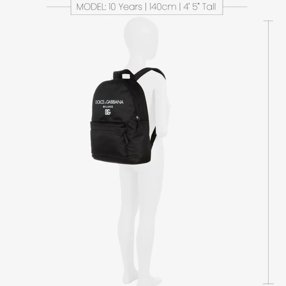 Black backpack from luxury brand Dolce & Gabbana, with stylish pewter hardware. Made in smooth nylon, there is a front zipped pocket for everyday essentials and a roomy main compartment with white logo branding. There is a useful carry handle and adjustable padded shoulder straps for a comfortable fit. A handy nameplate can be found on the back.