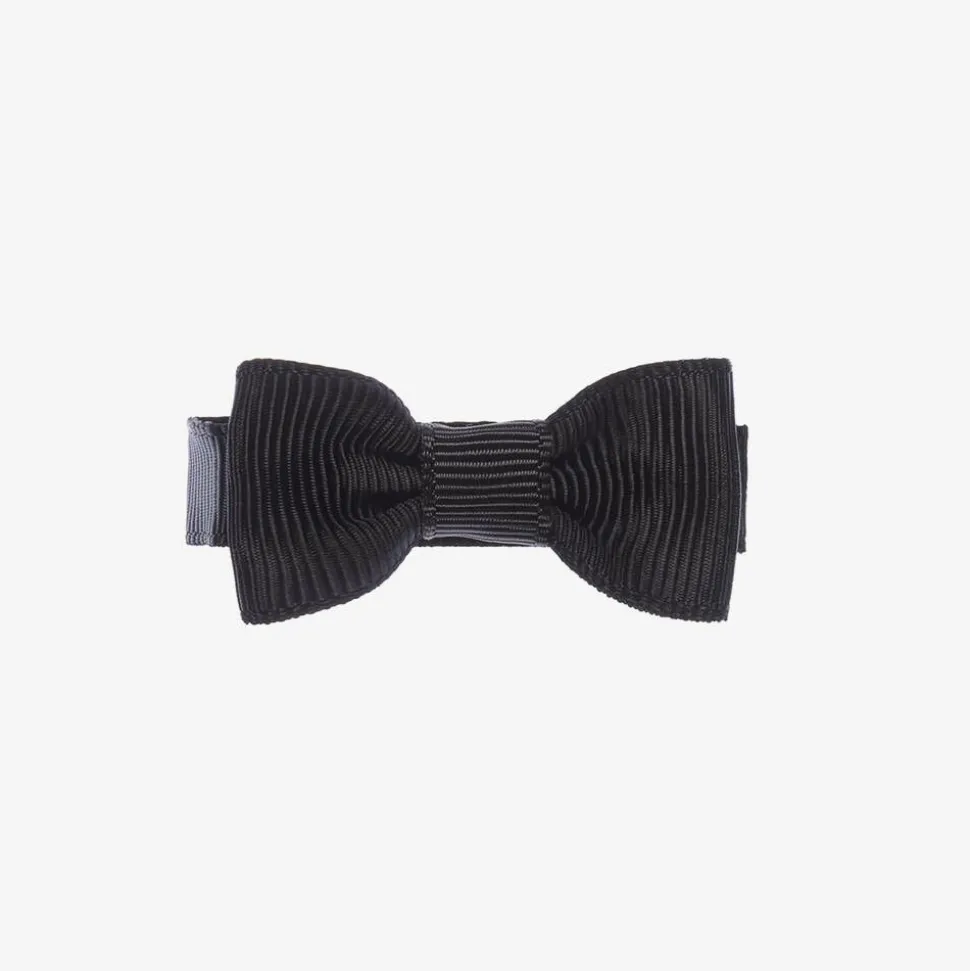 Girls black handmade bow hair clip by Peach Ribbons. A finishing touch to an outfit, this sweet accessory is made in grosgrain ribbon and set on a metal clip.