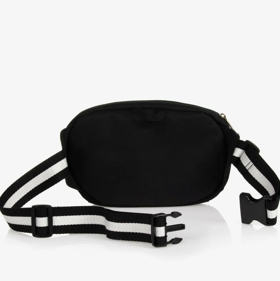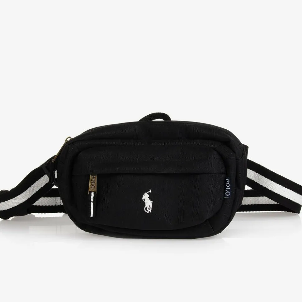 Black belt bag for boys and girls by Ralph Lauren, woven in durable canvas. There is a zip-fastening main compartment, with a smaller zipped pocket on the front. The striped black and white belt has a buckle clip fastening and can be adjusted for the ideal fit. The signature pony logo is embroidered on the front in white for instant designer appeal.