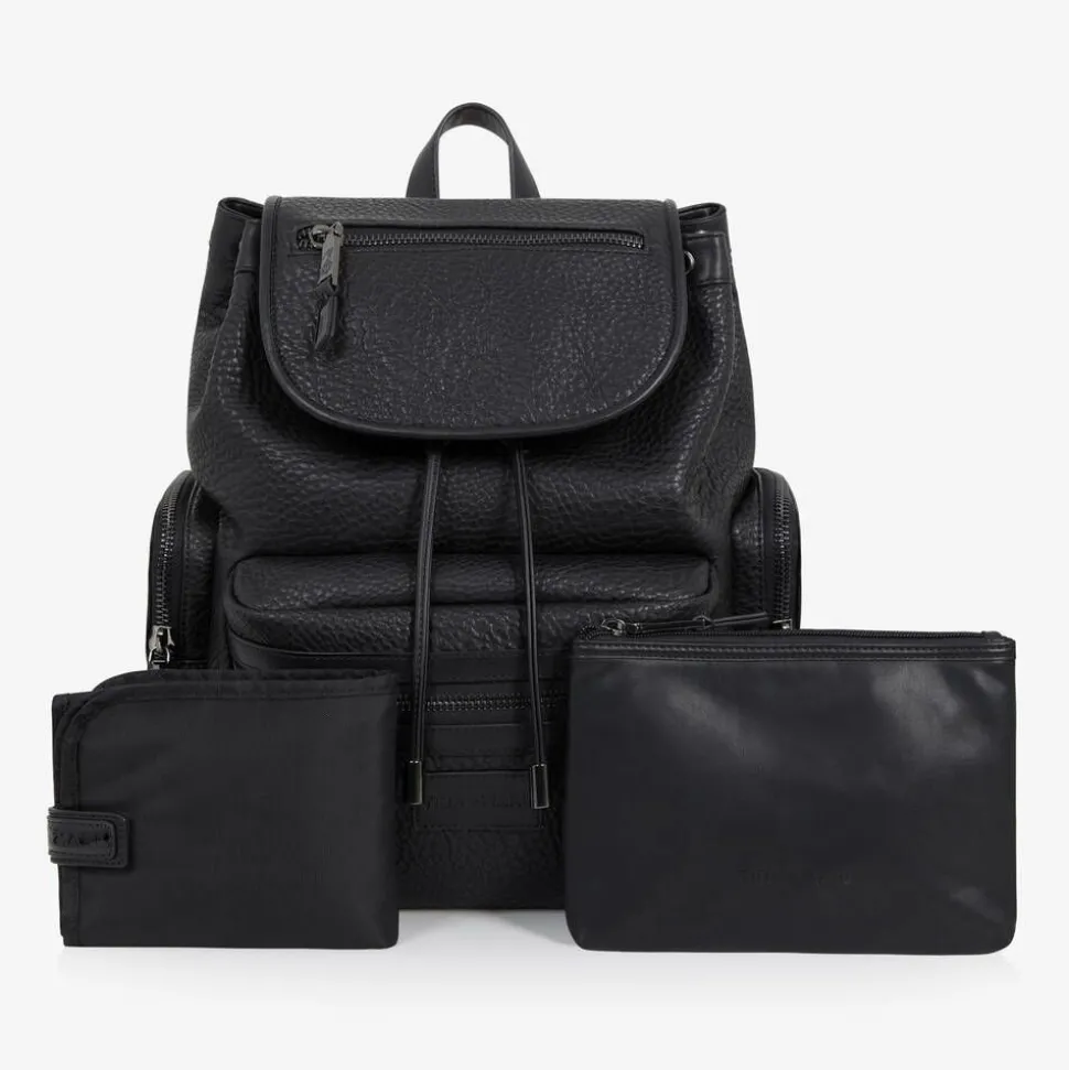 A smart black changing backpack by TIBA + MARL. It is made in smooth, recycled faux leather with a water-resistant and easy-to-wipe-clean, recycled woven lining. Inside the spacious main compartment, there is a useful laptop pocket, an insulated bottle holder, and an additional elasticated pocket. Stitched with a tonal logo patch, there is a large zipped pocket on the front and two zip-up pockets on the sides, one with insulated lining for extra practicality. Fastening with a drawstring and a magnetic clasp, the front flap has another zipped pocket for small essentials. The back panel and the adjustable straps are padded for added comfort and there is a top handle that can be easily hung on a hook. The D-rings on the sides can be attached to stroller clips (sold separately), and it comes with a zipped pouch and a padded changing mat.