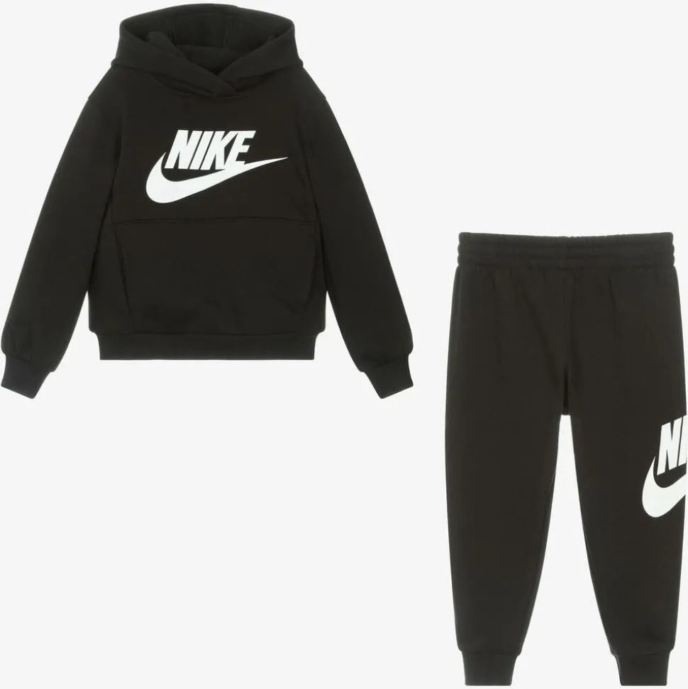 A black tracksuit for boys and girls by Nike, made from soft cotton jersey with a warm fleecy interior. Both pieces are printed with a bold white Swoosh logo for an iconic look. The hoodie has a useful pouch pocket on the front and the joggers have a comfortable elasticated waist.