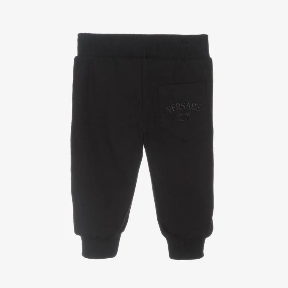 Inspired by the adult collection, these black joggers for younger boys and girls by luxury Italian label Versace, are made in soft, mid-weight cotton jersey. A casual piece with a striking designer touch, these comfortable joggers have the brand's ornate Wild Barocco print in gold and brown trimming the sides of both legs. Tonal logo embroidery on the back patch pocket adds an extra branded touch and the lightly ribbed ankle cuffs and gently elasticated waistband ensure comfort.