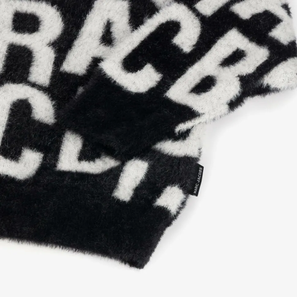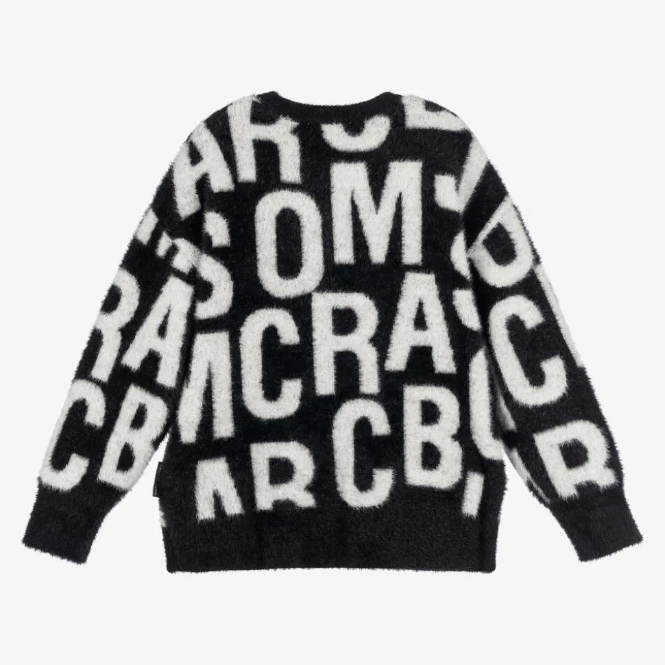 Soft and fluffy, black knitted sweater for boys and girls by MARC JACOBS. It is patterned in the designer's white jumbled logo for a statement look. This cosy jumper has ribbed trims and long sleeves, with a branded tab at the side seam.