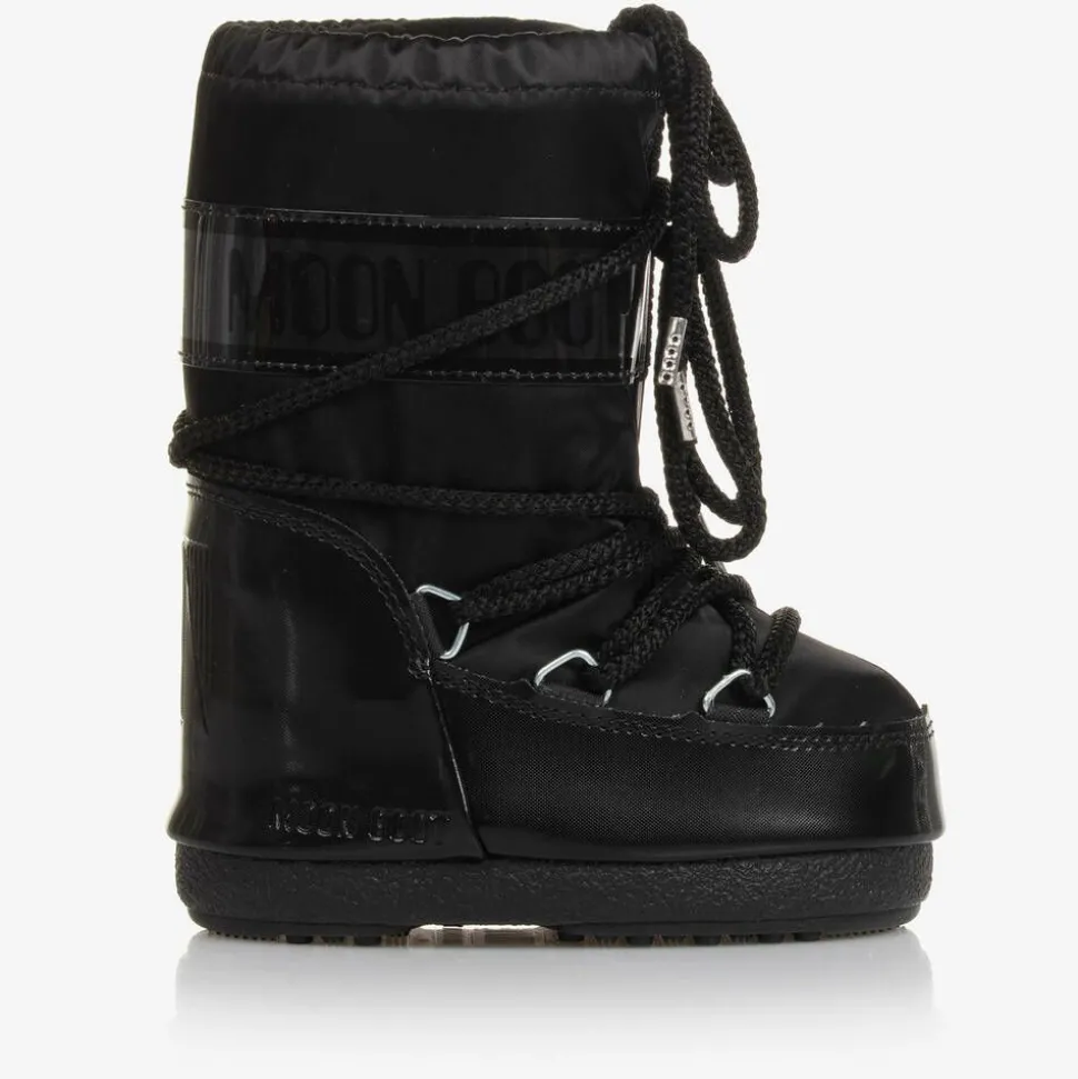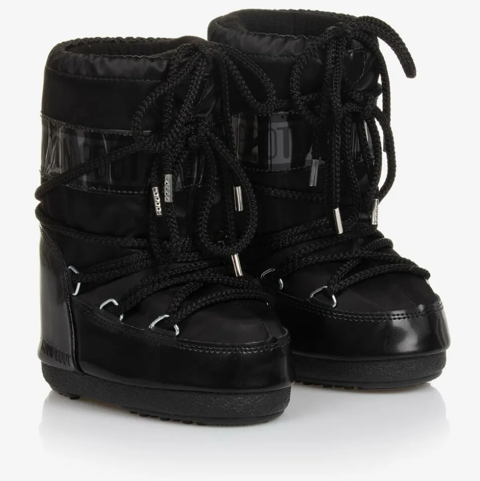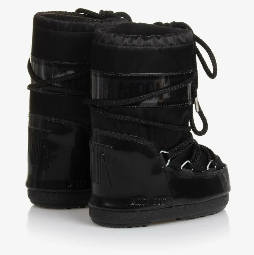Black snow boots for boys and girls by Moon Boot, made from a cool matte effect satin. A lovely addition to their après-ski wardrobe, they are heavily padded and ultra resistant in the signature original style. With a futuristic look, they have distinctive logo branding, decorative tie-up laces, and a drawstring on the cuffs to lock in warmth. The thermoplastic non-slip rubber soles, with tiny suction cups, add grip. The technological foam lining will feel snug at first but will mould to the size and shape of the foot after a few hours of wear.